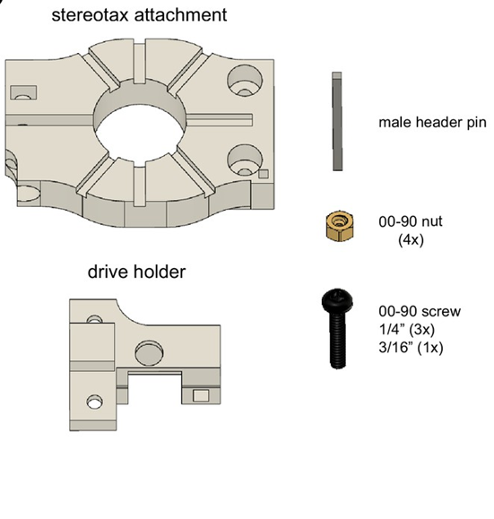 3Dneuro/Open Ephys ship the plastic holder and stereotax attachment fully assembled. We also provide two mirrored versions of the holder, allowing the user to choose how they distribute the working space during the implantation surgery. It may also help right-handed and left-handed users to work in their preferred configuration (see figure below).